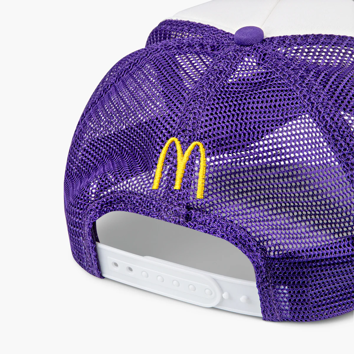 - Purple and white trucker style hat