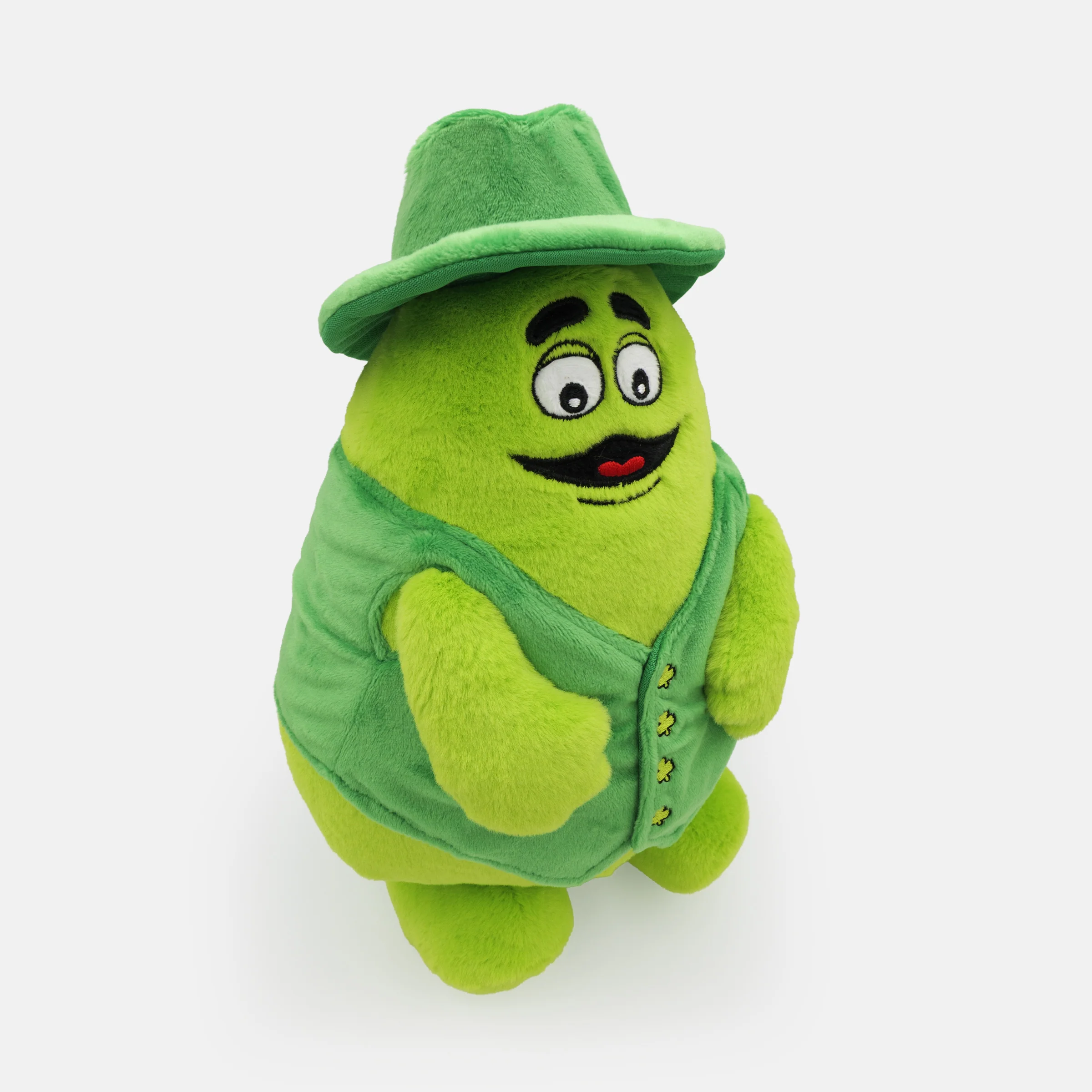 - Soft, huggable bright green plush featuring embroidered facial details, a shamrock-button vest, and matching hat.